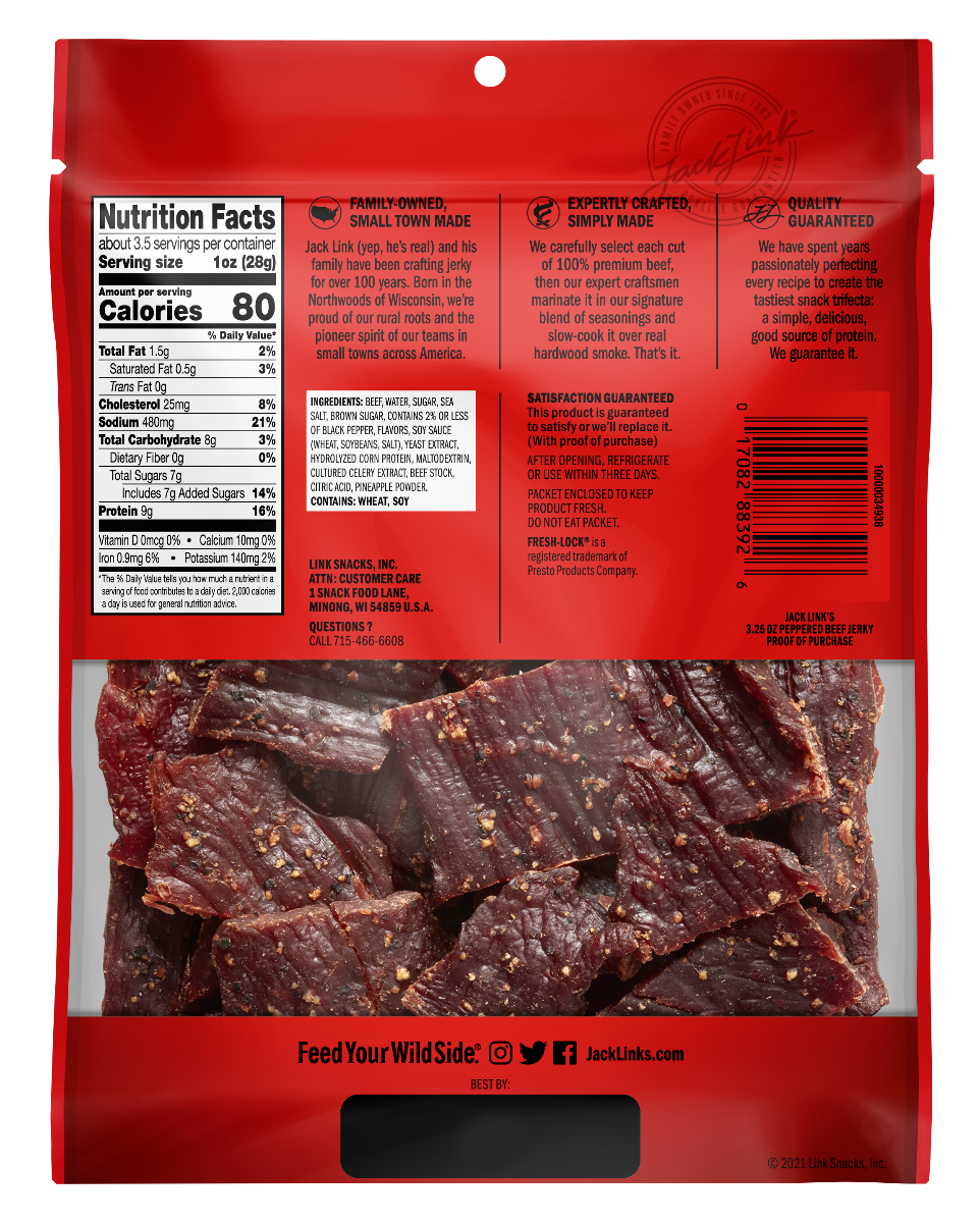Craving something bold? Take on the day with a little extra kick in your behind. This in-your-face seasoning blend will make your mouth water with its notes of cracked black pepper and dashes of garlic. Black pepper is one of the earliest spices known on earth, so it makes sense to give this spice its own delicious jerky flavor. And sure, there are a ton of peppered jerkies out there – but what makes us different? Our seriously passionate expert craftsmen who pay attention to every detail. Our tender beef is carefully marinated with real spices and smoked over real hardwood to give it a smoky finish. With 9g of protein and only 80 calories per serving, it's the perfect protein snack to pack for your lunch break or to take to the tailgate. Plus, our packaging is resealable so you can taste peak freshness every time you take a bite.